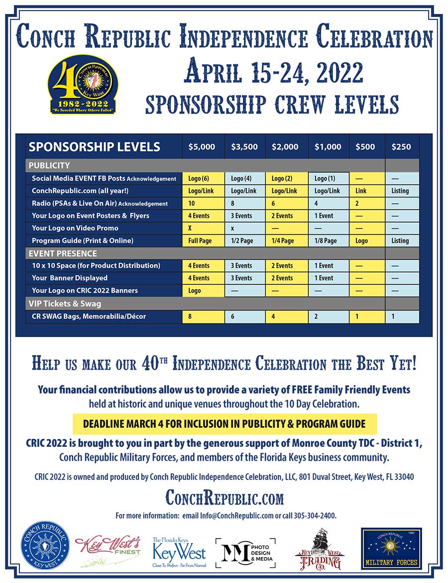 Sponsorships Phone (305) 296.9694 Web conchrepublicmilitaryforces.com Email CRMFKW@gmail.com Address PO Box 1153Key West, FL 33041